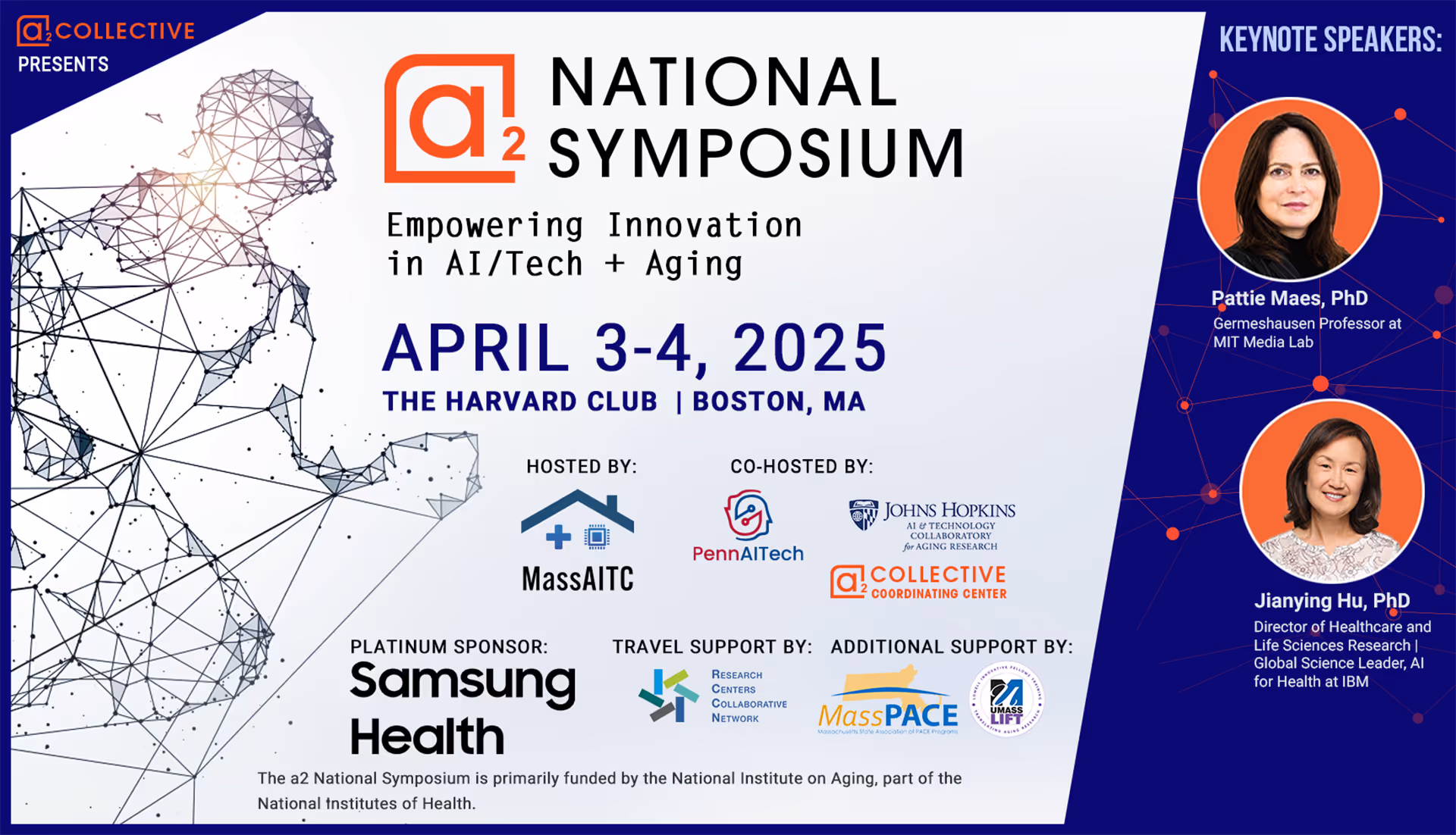 On April 3–4, 2025, the a2 Collective, a research program funded by the National Institute on Aging (NIA), part of the National Institutes of Health (NIH), convened its third annual a2 National Symposium to discuss progress, opportunities, and challenges in the design, implementation, evaluation, and commercialization of AI and other emerging technologies for healthy aging and caregiver support. The a2 Collective represents the Artificial Intelligence and Technology Collaboratories (AITC) for Aging Research program, through which NIA plans to award at least $40M over a 5-year period to fund AgeTech pilots with the potential to improve the lives of older adults, including individuals with AD/ADRD, and their caregivers. The symposium was hosted by MassAITC at the Harvard Club of Boston and attended by nearly 200 in-person and more than 50 virtual participants.