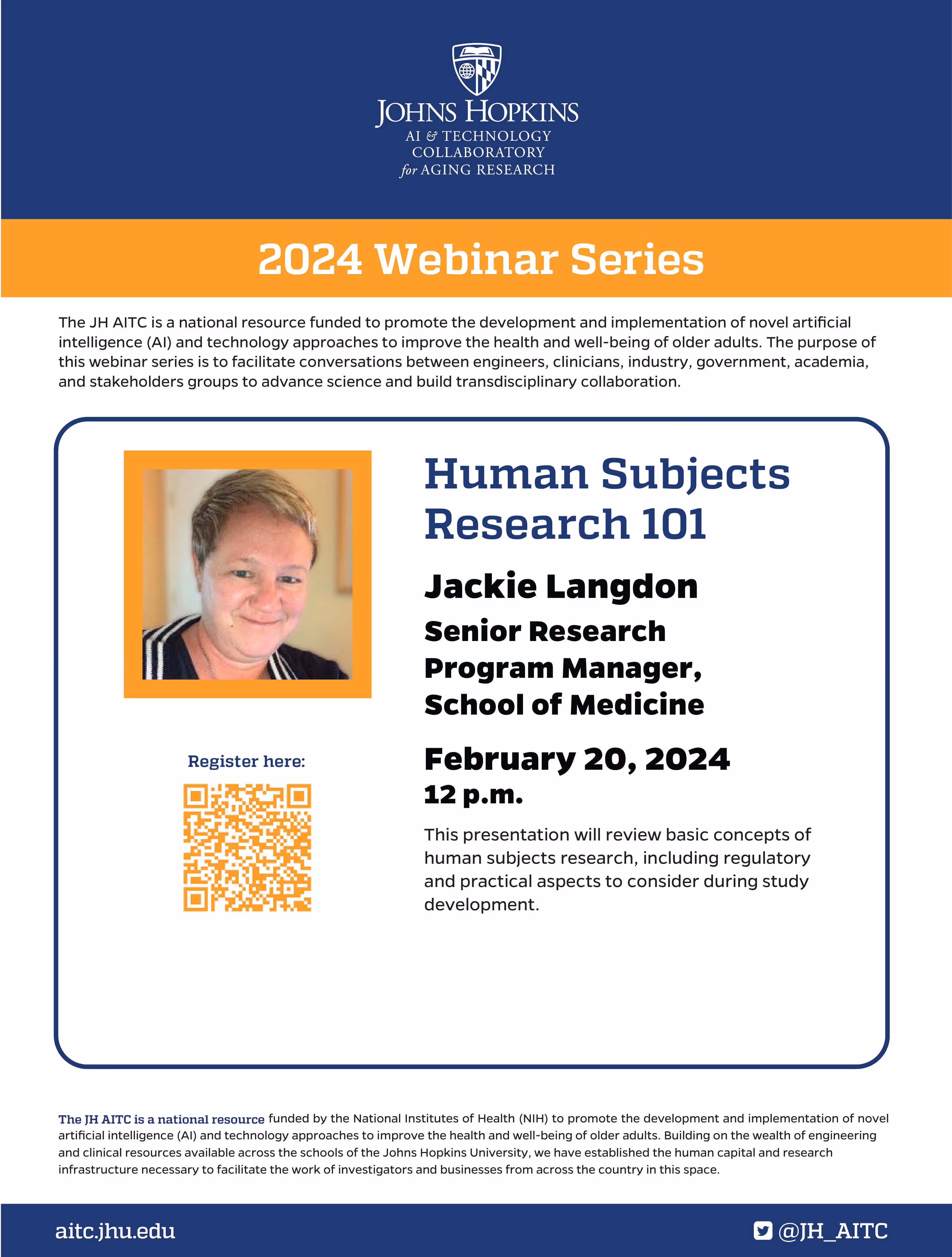 JH AITC's next webinar will feature Jackie Langdon, Senior Research Program Manager in the Johns Hopkins University School of Medicine, presenting "Human Subjects Research 101." The webinar will be held at 12 p.m. ET on Tuesday, Feb. 20 and will review basic concepts of human subjects research, including regulatory and practical aspects to consider during study development. Register here.