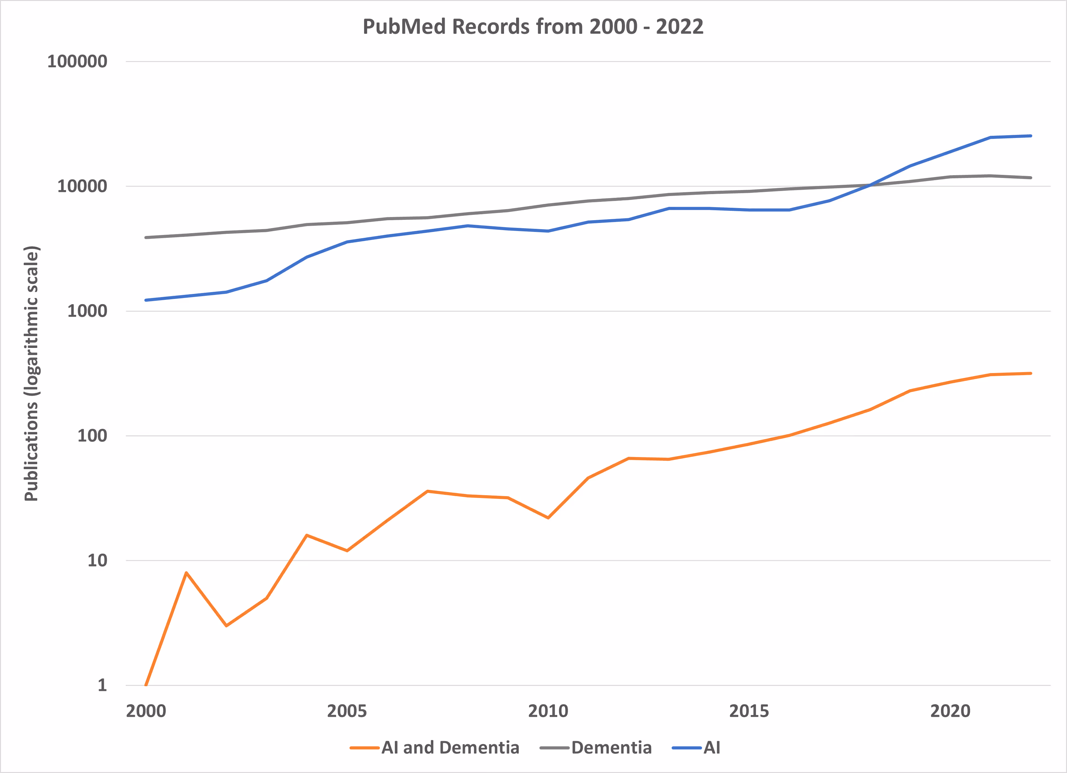 Figure 1 is a line graph of the number of publications from 2000 to 2022 returned for each query. However, because the number of articles returned for the Medical Subject Headings (MeSH) query “Dementia” AND “Artificial Intelligence” was much lower compared to the other queries, the figure cannot sufficiently display all data. Instead, in Figure 2, the number of articles is represented using a logarithmic scale to display a much larger range of data. This scale begins at log(0), which is equal to 1, and increases by logarithmic values, allowing all three publication trajectories to be represented on the same axis.